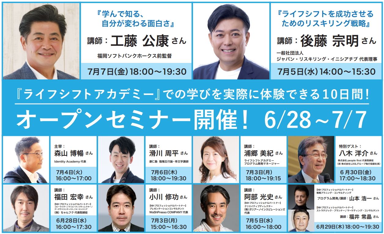 6月15日(木)からは個人参加をご検討いただける方向けオンライン説明会を、6月28 日(木)~7月7日(金)の期間中にはオープンセミナーとしてライフシフトのための学びを体系化して提供する活動を実際に体験できるイベントの開催を予定しております。
