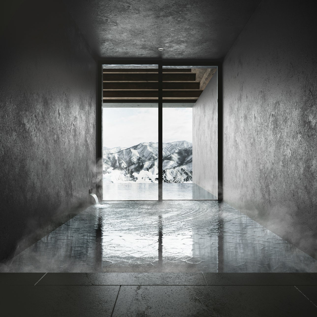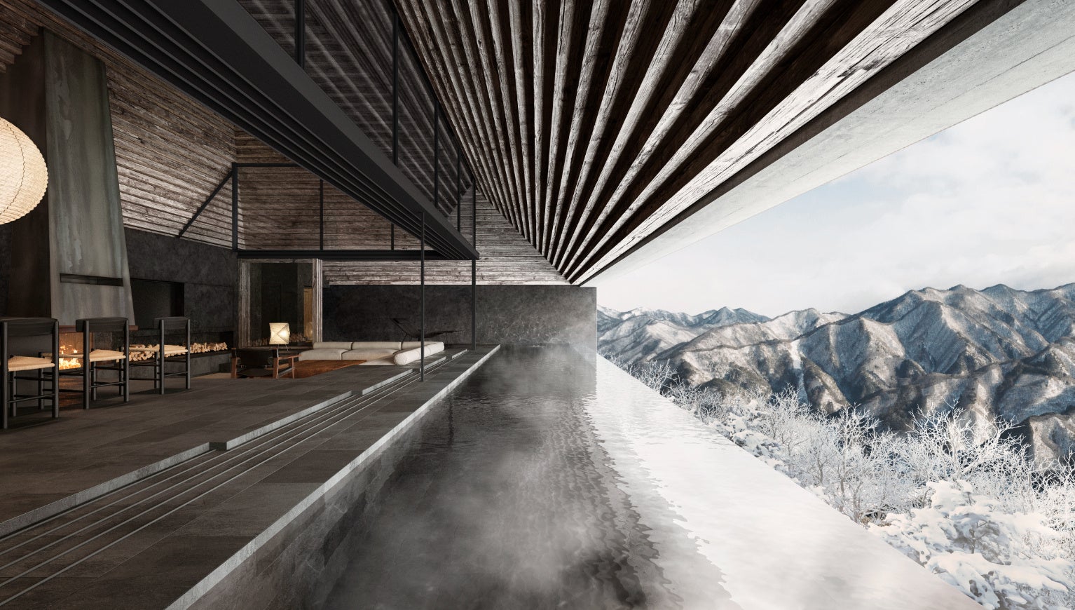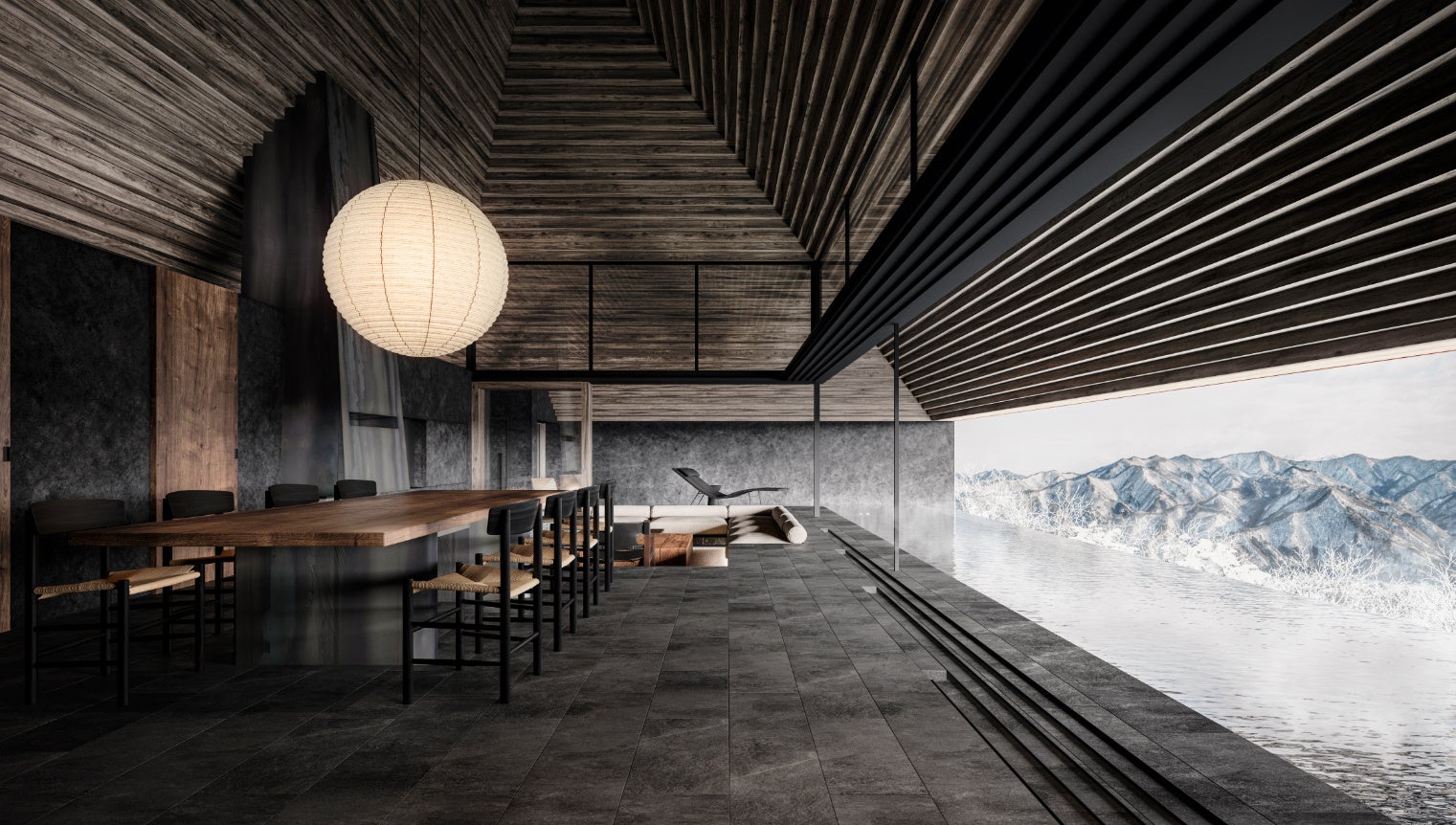 利根川の美しく豊かな水源と 歴史ある温泉に恵まれた水の都、みなかみ。 人工物が一切目に入らない、雲海を望む山頂。 懐かしさを感じる原風景と、湯治文化を再解釈することで生まれる、 新しい温泉集落の風景。室内に設けた水面越しに雪景色を望む、日常を忘れさせてくれる空間。