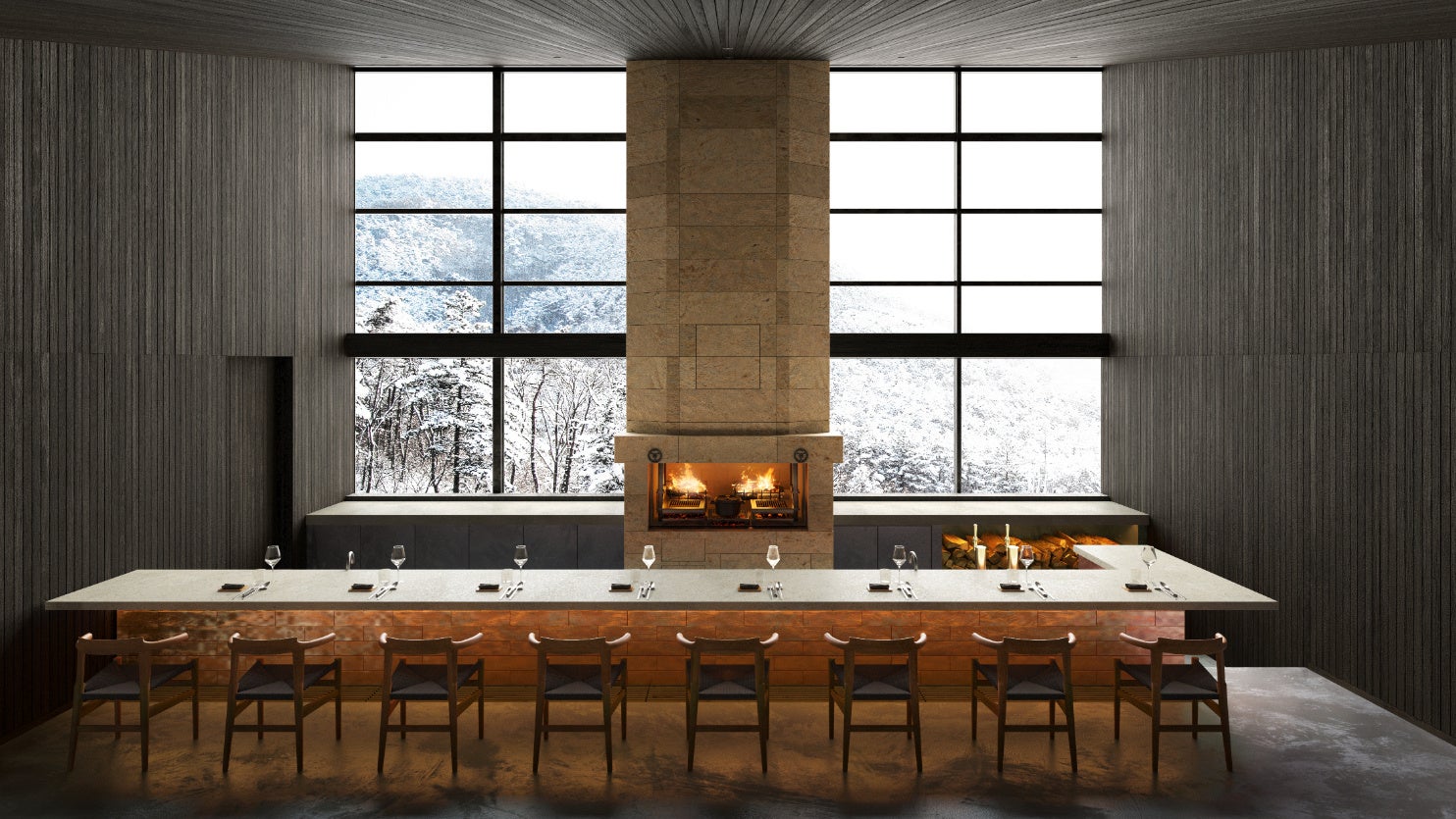 ヴィラに隣接する、滞在者限定の薪火料理レストラン。開放的な空間に聳え立つのは、シ ンプルながら奥深い薪火料理のための特注グリル。「谷川茸」や「雪割茸」をはじめ「花いぶき」という蕗の薹など水上ならではの食材をふんだんに使用します。土地の味覚を知り尽くしたシェフが振る舞う、食材のポテンシャルを引き出したここだけの食体験を。