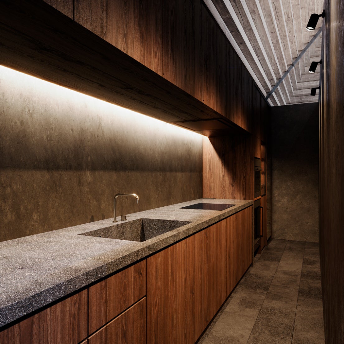 ダイニング裏のスペースには十分な広さを確保したキッチン設備。敷地内に隣接するオーナー専用のレストランのほか、自ら調理を楽しむこともできる。スナックやドリンク、アメニティを販売するミニバー、ワインセラーも完備。