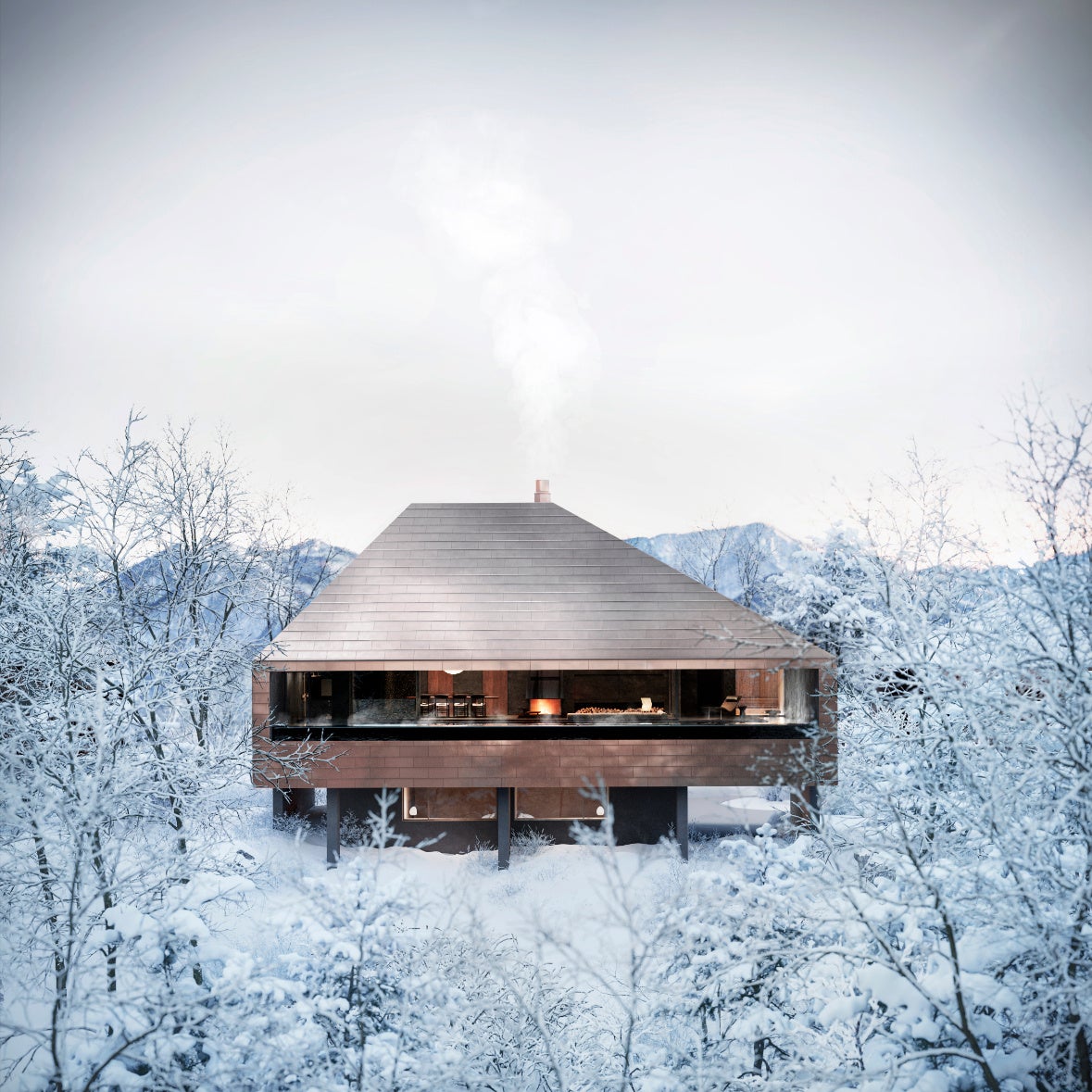 誰もが日本の原風景として持っている、伝統的な山小屋を再解釈した特徴的な外観。風合いが豊かな外壁には銅板一文字葺を使用。ベッドルームやシャワールーム、専用駐車場を備えた1階部分と、露天風呂やリビングを備えた2階部分から構成。訪れた時からプライベートな空間に身を置くことのできる建築。