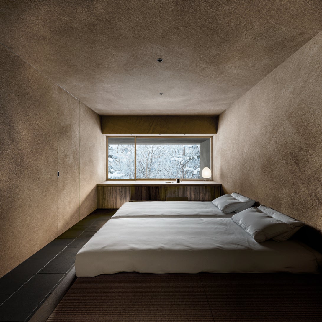 長方形の窓から望む借景を眺めながら目覚めることができる寝室。壁の質感が落ち着いた雰囲気を演出。計2つの寝室を備え、畳の肌触りが心地良いリラックス空間として用いることもできる。