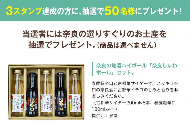 デジタルスタンプを3つ集めてスタンプラリーを達成すると、抽選で50名様に奈良の地酒ハイボール「奈良しゅわボール」セットなど、奈良の選りすぐりのお土産をプレゼントいたします。