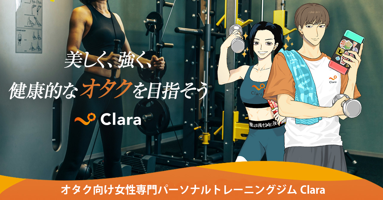 「Clara(クララ)」は、オタク女性の身体のお悩みに寄り添い、 美と健康をお届けするというミッションを掲げる、業界初・オタク女性専門パーソナルトレーニングジムです。