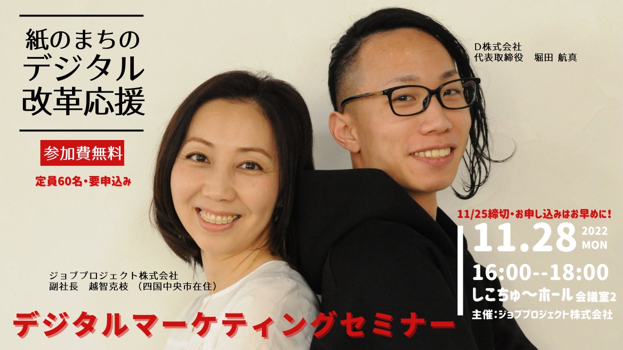 ジョブプロジェクトでは、デジタルデバイドといわれる地方における地域格差を少しでもなくし、地方がより活性化していけるようにデジタルマーケティングのノウハウを地域の皆様にお伝えしていくことを目的として愛媛県四国中央市で本セミナーを開催いたします。