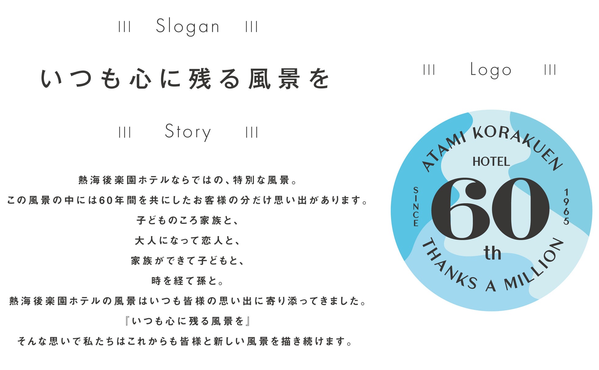 「いつも心に残る風景を」をスローガンに、開業60周年記念キャンペーンを実施していきます。今まで熱海後楽園ホテルをご利用いただいたお客様との思い出、これからご利用いただくお客様との思い出を大切に、お客様それぞれの特別な風景に寄り添っていけるよう、感謝の気持ちを忘れずに、努めてまいります。