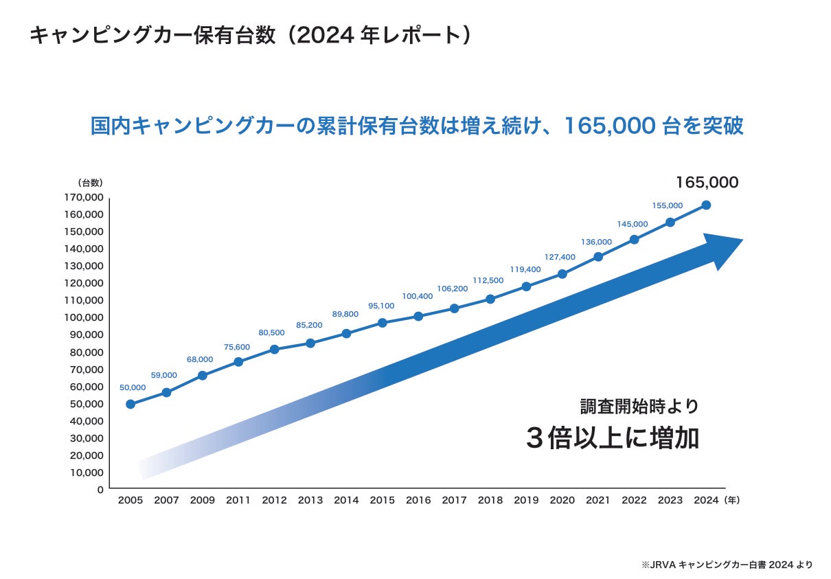 一般社団法人日本RV協会(JRVA)が発表した「キャンピングカー白書2024」によると、国内のキャンピングカー累計保有台数は165,000台を突破。