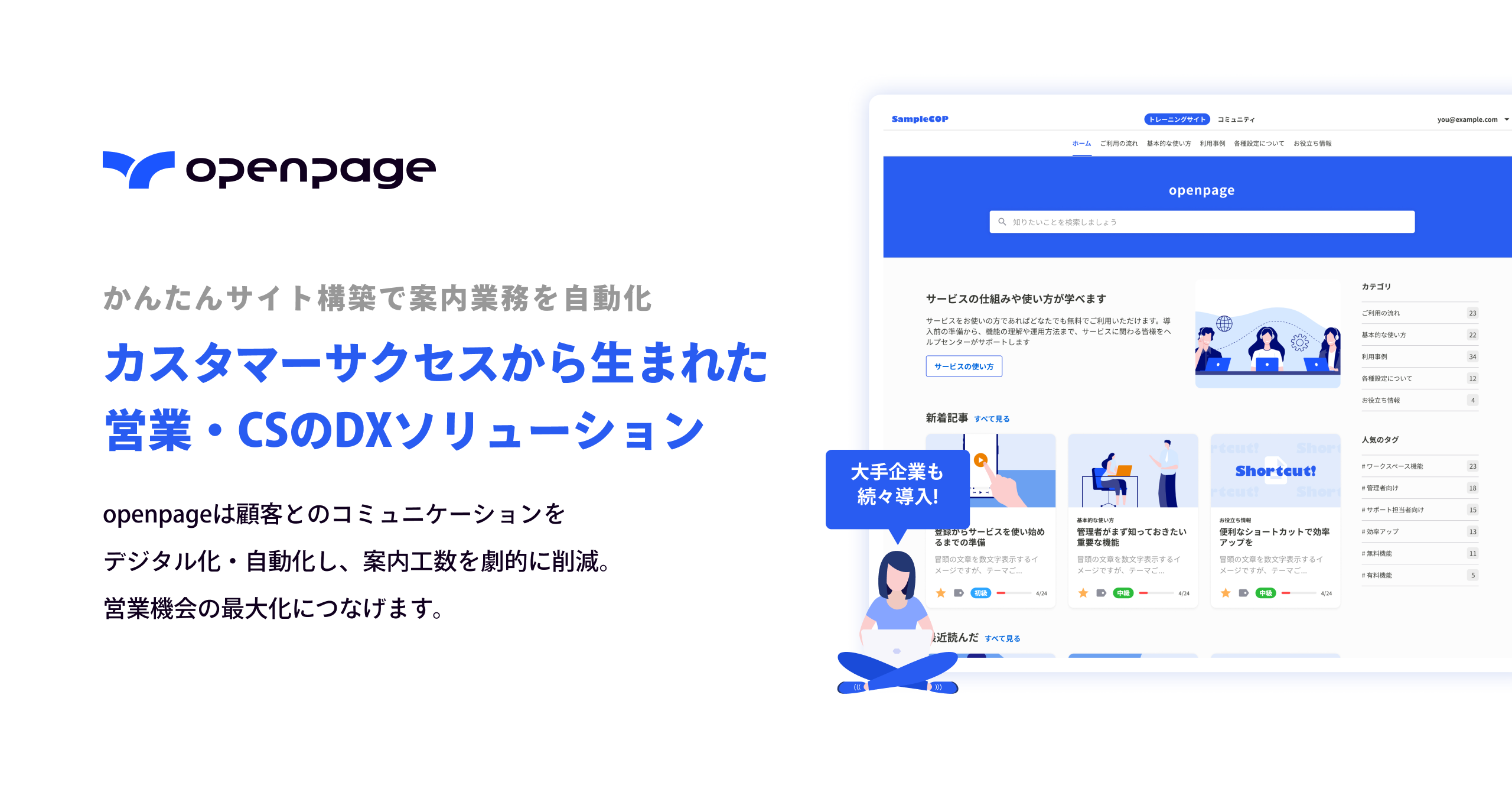 当社は、カスタマーサクセス(以下、CS)を熟知するメンバーを中心に構成され、顧客取引DXツール「openpage」を開発・提供しています。2023年より、CSに加え営業向けにも事業を展開しており、米国流のCSやセールステックをはじめとする顧客取引DXにおける最新情報をSNSや執筆、イベントなど様々な方法で発信し、啓蒙活動を行っております。