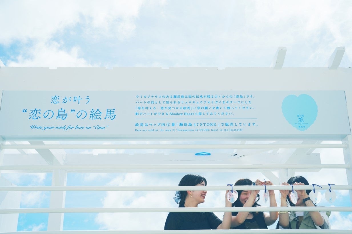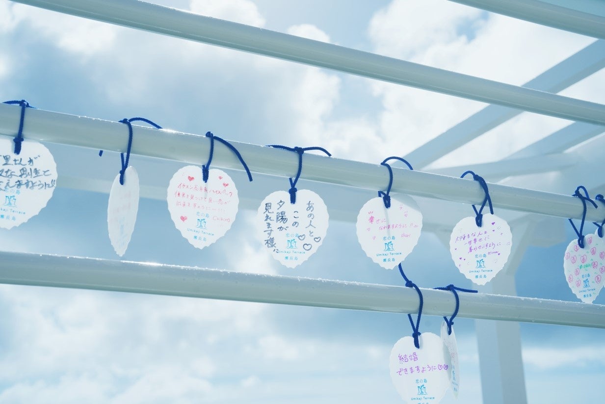 古来より恋愛運アップと子宝のパワースポットとして知られている瀬長島。その恋のパワーを来島した皆様にお持ち帰りいただくための恋愛スポットを続々新設中の瀬長島ウミカジテラス。今回は新たに、ハートの形の貝をあしらった新たな“恋のおまじない” 『恋が叶う絵馬』が「恋のテラス」に誕生しました。
