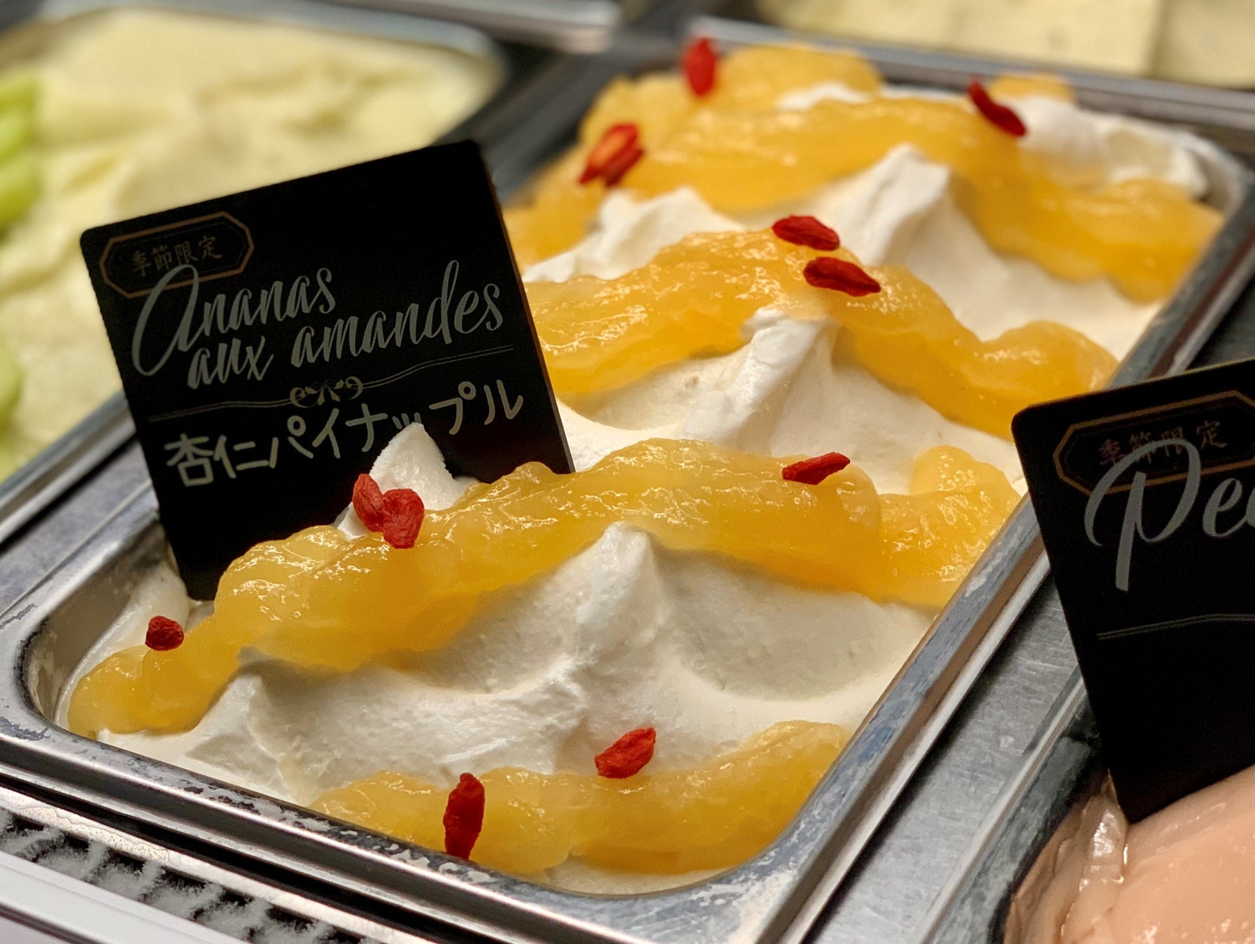 杏仁ミルクのジェラートにパイナップルのコンフィチュールを混ぜ込みました。口に入れた瞬間広がる杏仁の香りと爽やかなパイナップルがアクセントのジェラート。
