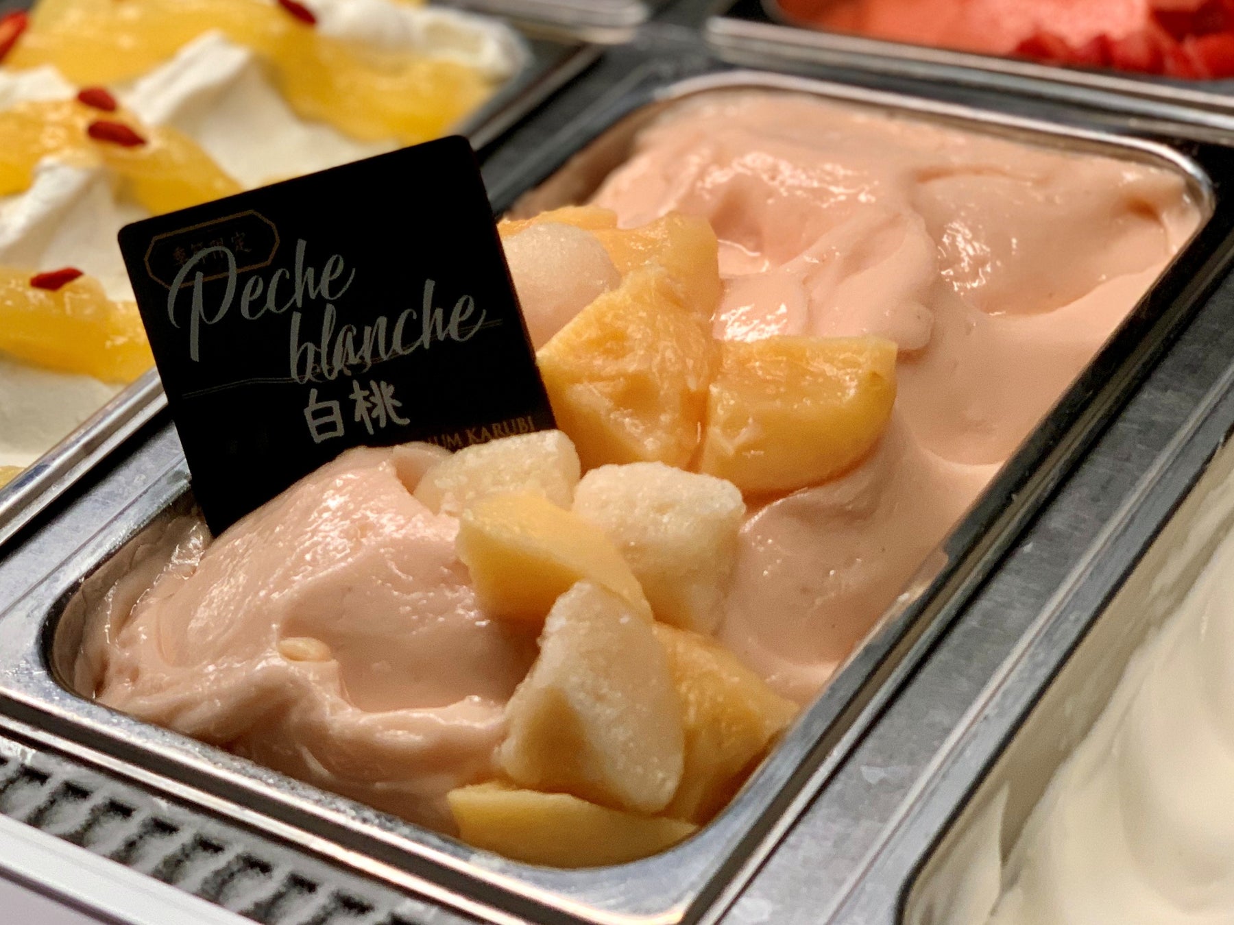 白桃を惜しみなく使ったジェラート。みずみずしい白桃の果肉感が感じられる。
