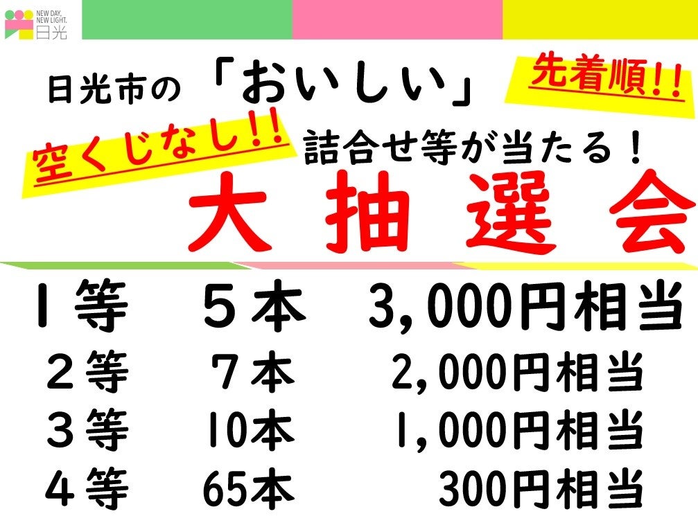 当日会場で「ちょこっとじゃないちょとれいと」または「しゃりまんてん」をご購入いただいた方には、日光市の数ある名産品からセレクトした人気商品の詰合せ等が当たるガチャガチャ抽選会にご参加いただけます。日光金谷ホテルの「百年ライスカレー」や、吉田屋羊羹本舗 の「一口羊羹」など、人気&プレミアムな商品を多数ご用意しておりますので是非、ご参加下さい。