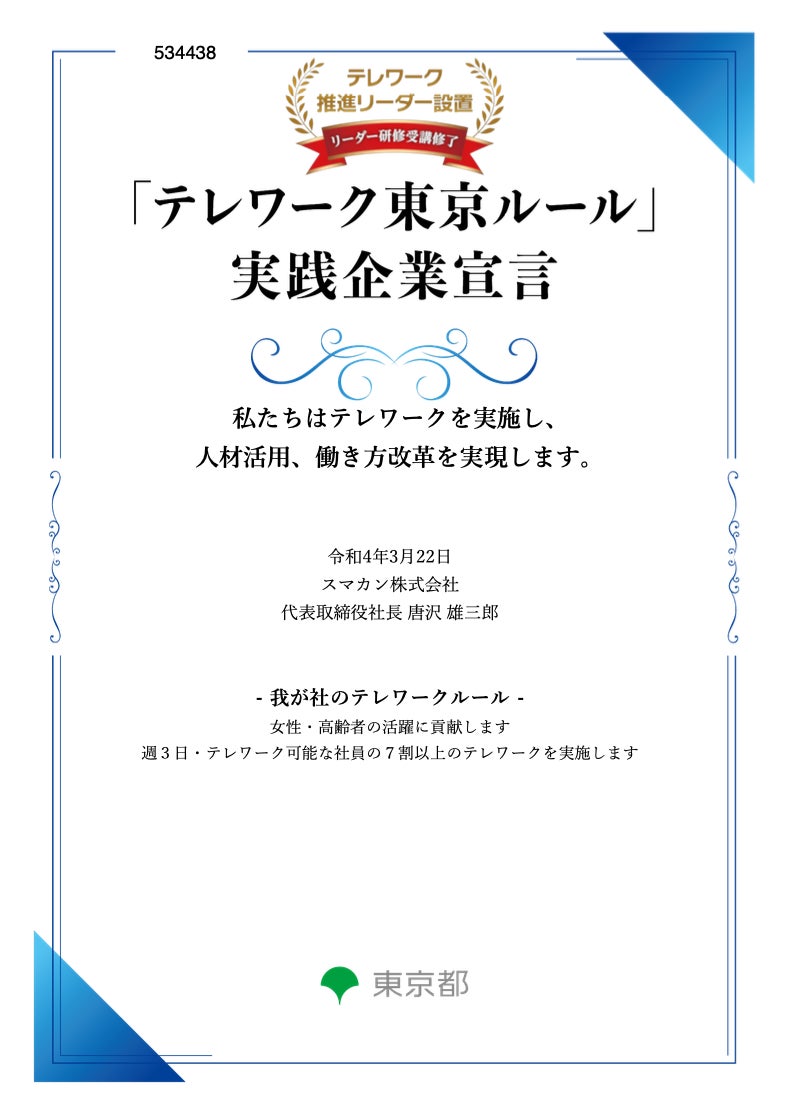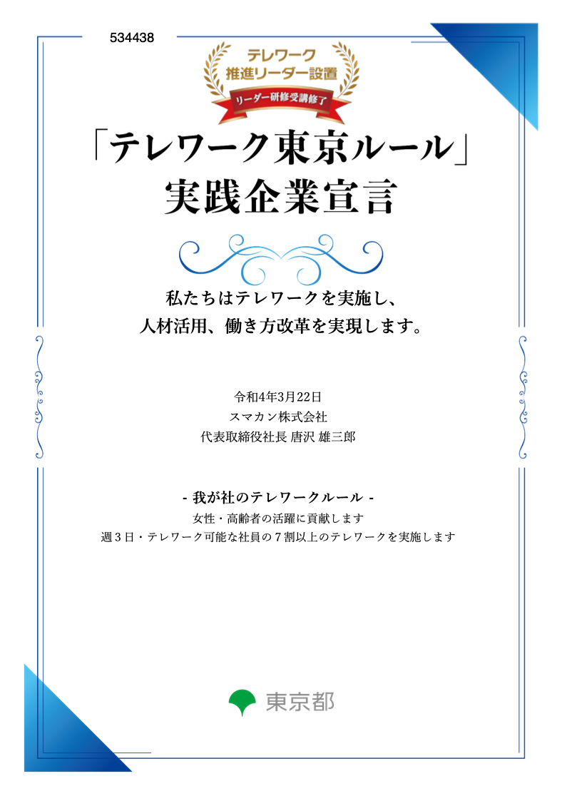 スマカン、東京都が提唱する「テレワーク東京ルール」実践企業に認定