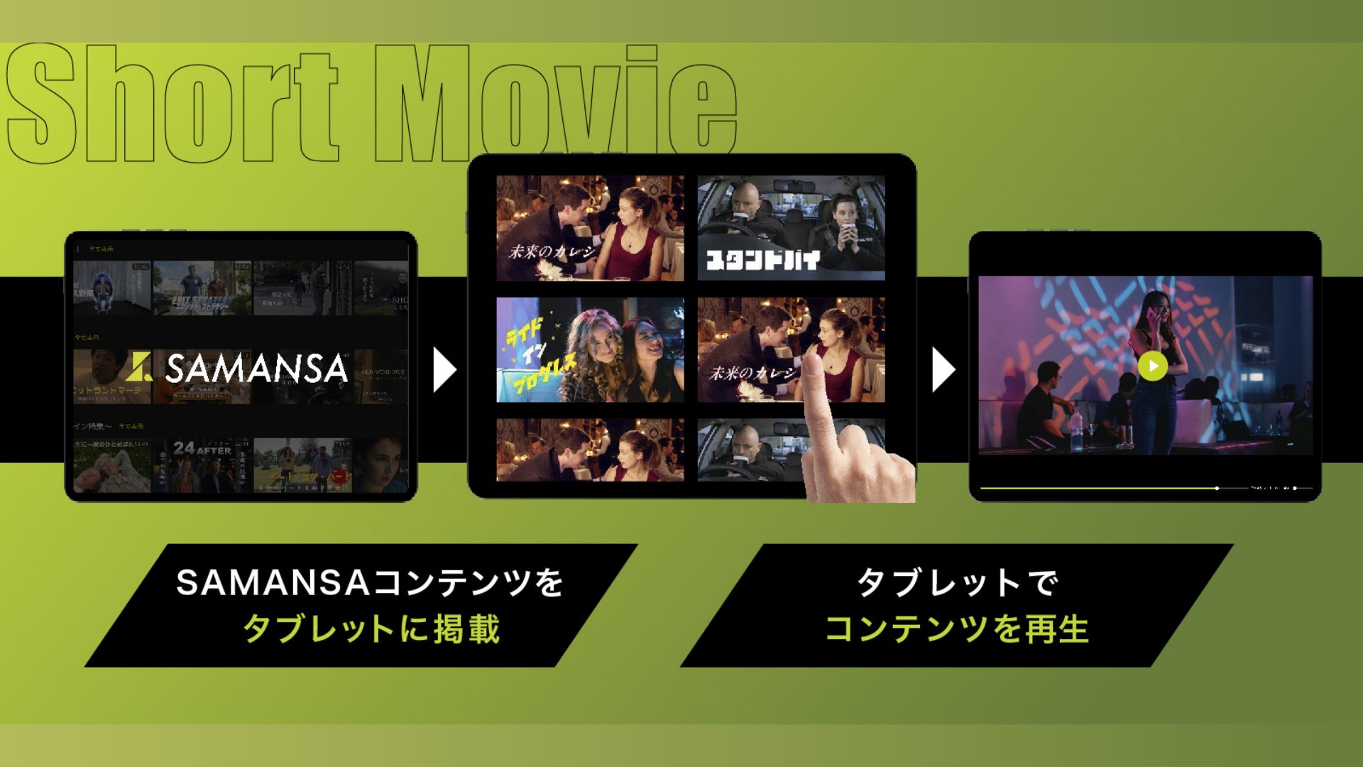 ショート映画配信サービス「SAMANSA(サマンサ)」の作品の一部が、株式会社MADSが運用するタブレット型サイネージ「OCTAVE byMADS」で視聴可能になりました。「SAMANSA(サマンサ)」がコンセプトに掲げる「その10分、映画でリッチに」を体現するため、美容室の顧客体験を変えていきます。スキマ時間を劇的に変化させるピュアで力強いショート映画をお楽しみください。