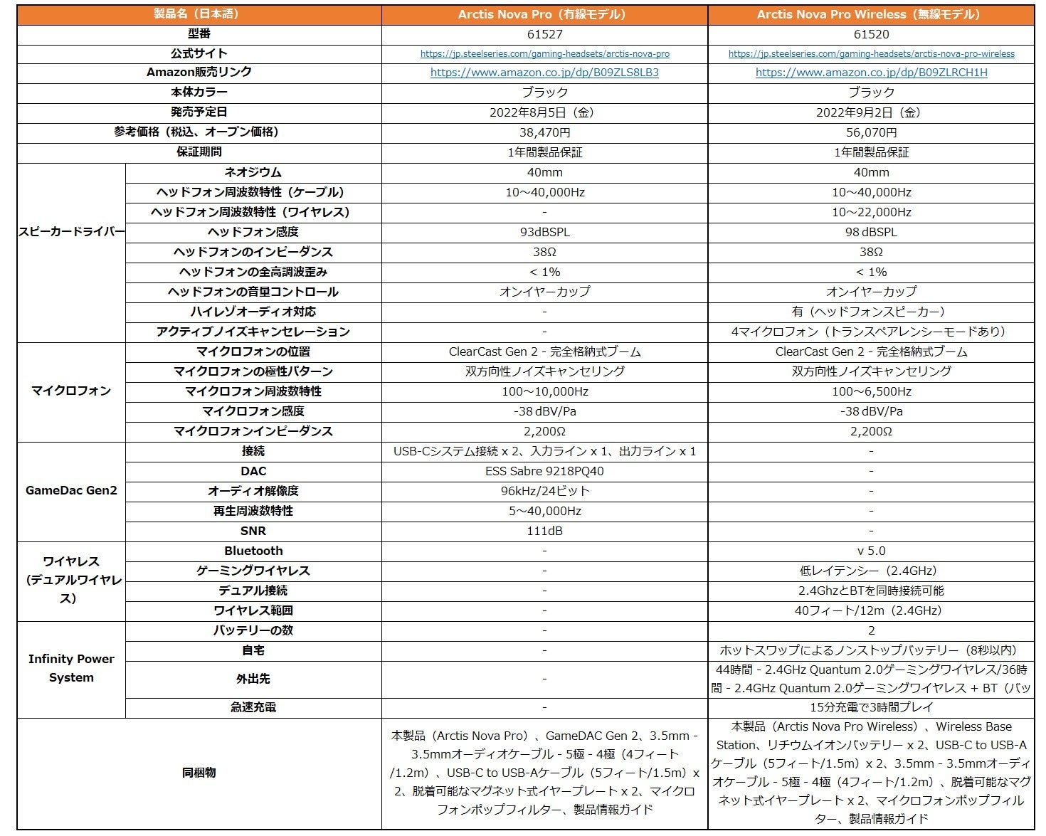 両モデルとも7月26日(火)より予約受付開始、有線モデルの「Arctis Nova Pro」は8月5日(金)から、ワイヤレスモデル「Arctis Nova Pro Wireless」は9月2日(金)から、全国の家電量販店、及びAmazon.co.jpにて順次販売開始いたします。