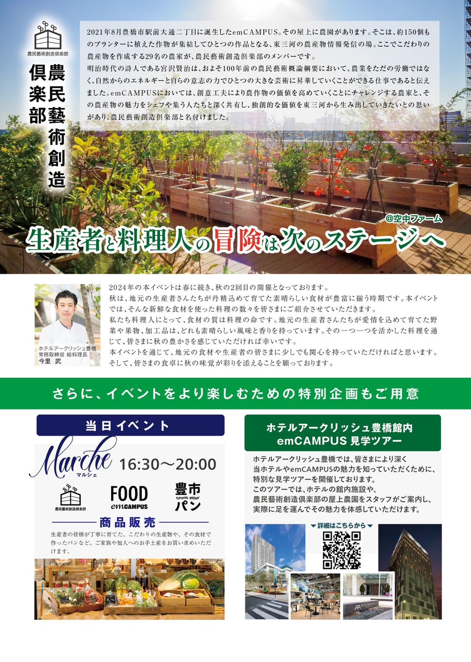 開業16年目を迎えたホテルアークリッシュ豊橋は、この土地や生産者の皆さんとともに成長を続けてきました。卓越した技術や経験を持ち合わせた農民藝術創造倶楽部の皆さんとコラボレーションし、総料理長今里武が食材の魅力を引き出したこの日限りの特別な料理にして提供します。