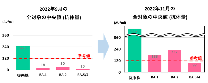 ただ、2022年9月末時点と比較すると、2022年10月末以降はBA.5に対する抗体も増加していますが、2022年10月末から2022年11月末にかけては、ワクチン接種の増加指標となり従来株に対する抗体量が増加しているにもかかわらず、BA.5に対する抗体量は、ほとんど変化が見られませんでした。また、2ヶ月以上経過しても、十分な抗体量(参考値[※2])を保有できていないことが分かりました。