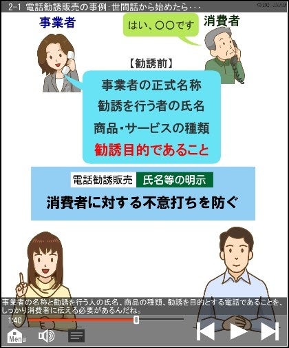 株式会社日本能率協会マネジメントセンター(代表取締役社長:張士洛、中央区、以下JMAM[ジェイマム])は、オンラインで学べる法人企業向け教育ツール「eラーニングライブラリ」※1の12月新コースとして、『消費者トラブルを未然に防ぐ 特定商取引法入門コース』を、12月24日に開講いたしました。