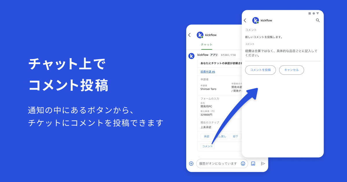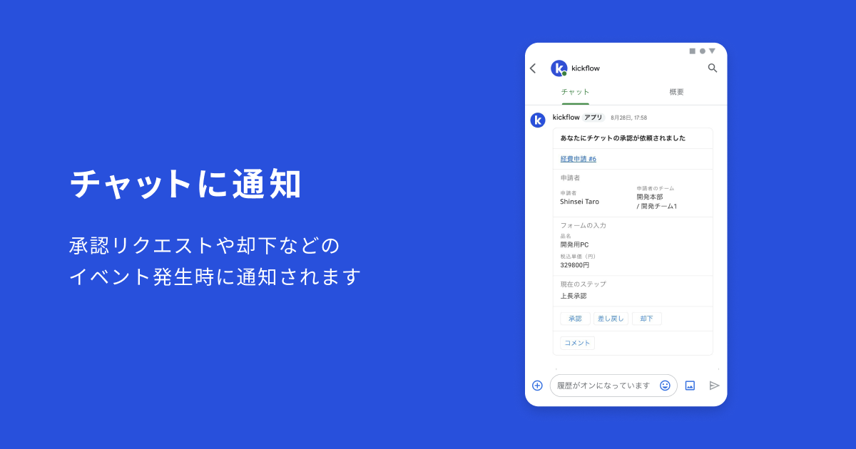 これまでkickflowはSlack、Chatwork、Microsoft Teams、LINE WORKSとの連携機能を提供し、承認スピード加速の後押しをしてまいりました。そうした中で、「Google Chat」をお使いのお客様からも連携要望を数多くいただいており、本機能のリリースとなりました。