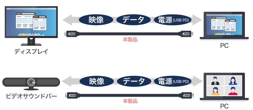 USB Power Delivery対応により、2mのJM-U3CC02/100Wは最大100W(20V/5A)、3mのJM-U3CC03/60Wは最大60W(20V/3A)の大きな電力の供給を行うことができます。PCなどのソース機器とディスプレイを本ケーブルで接続すれば、ディスプレイからソース機器へ、またはソース機器からディスプレイへ電源を供給できるため、配線をすっきりとまとめることができます。