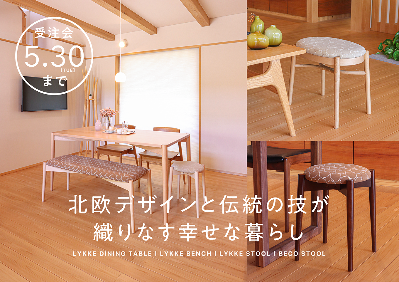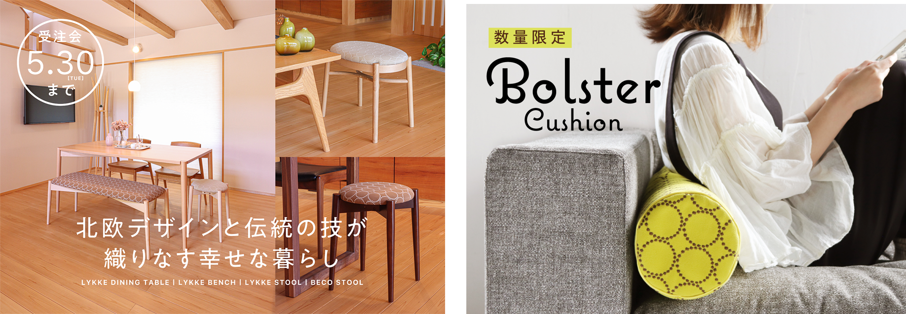 ミナ ペルホネンの生地”tambourine”を使った秋田木工のダイニングシリーズと丸くてかわいいボルスタークッションの期間限定受注会を開催します!!