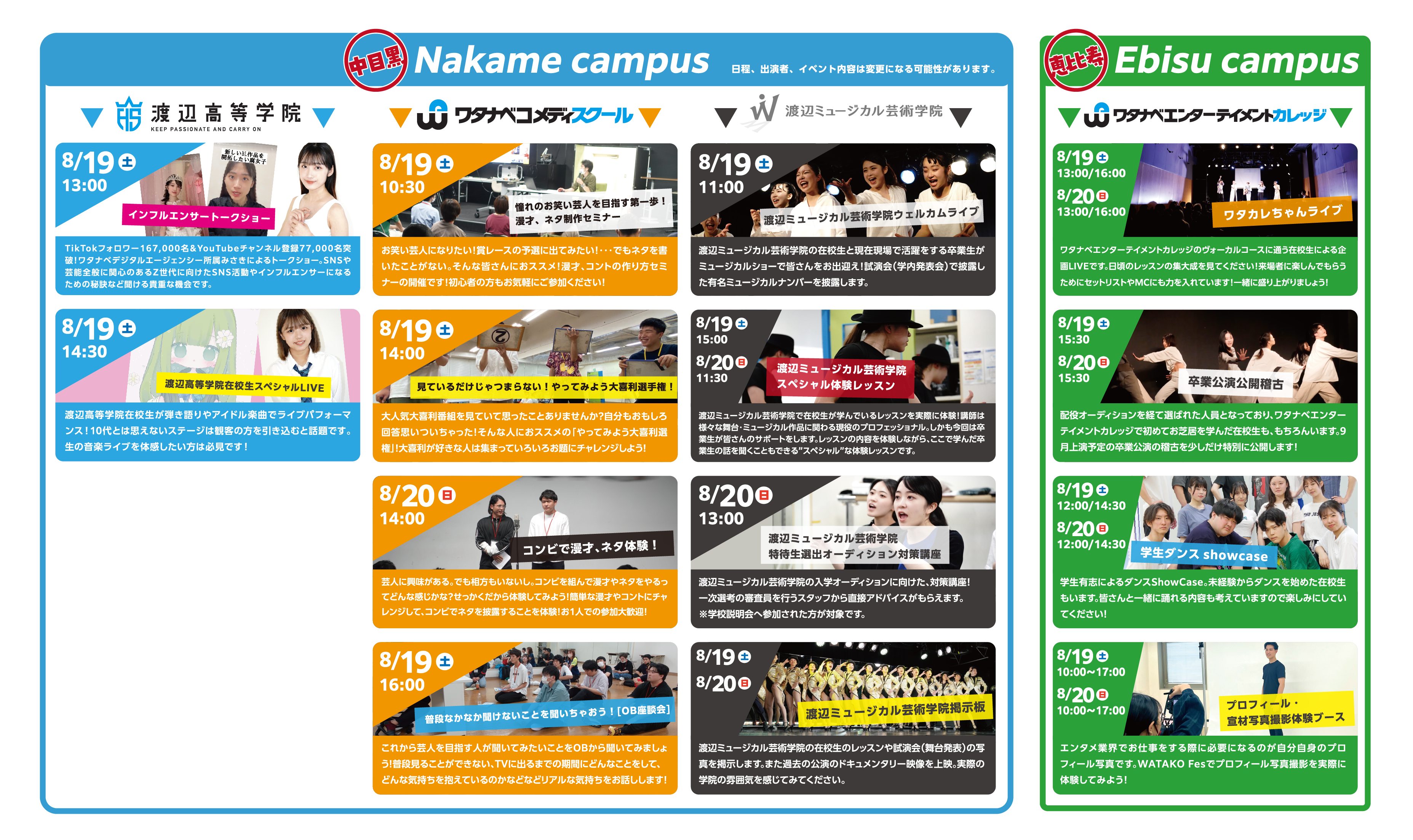 芸能プロダクション「ワタナベエンターテインメント」のスクール部門である「ワタナベエデュケーショングループ」にて日々レッスンをおこなっているWATAKO(ワタ校)生による、演劇、LIVE、ダンス、ミュージカル、お笑いなどを詰め込んだエンターテイメント型オープンキャンパスです。