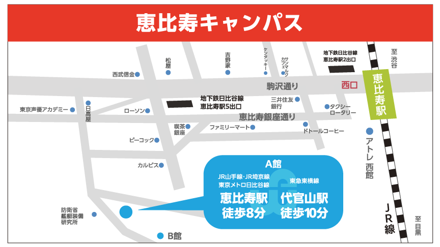 ■ワタナベエンターテイメントカレッジ恵比寿A館(〒150-0022 東京都渋谷区恵比寿南2-12-18)