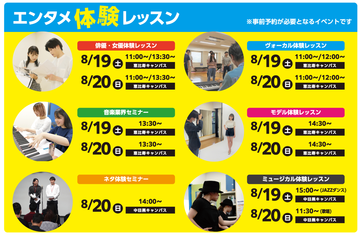記念すべき第1回目となる今回は、中目黒キャンパスと恵比寿A館キャンパスの2会場で同時開催!ワタナベエデュケーショングループだからこそ出来る、豪華タレントによるトークショーも予定しています。