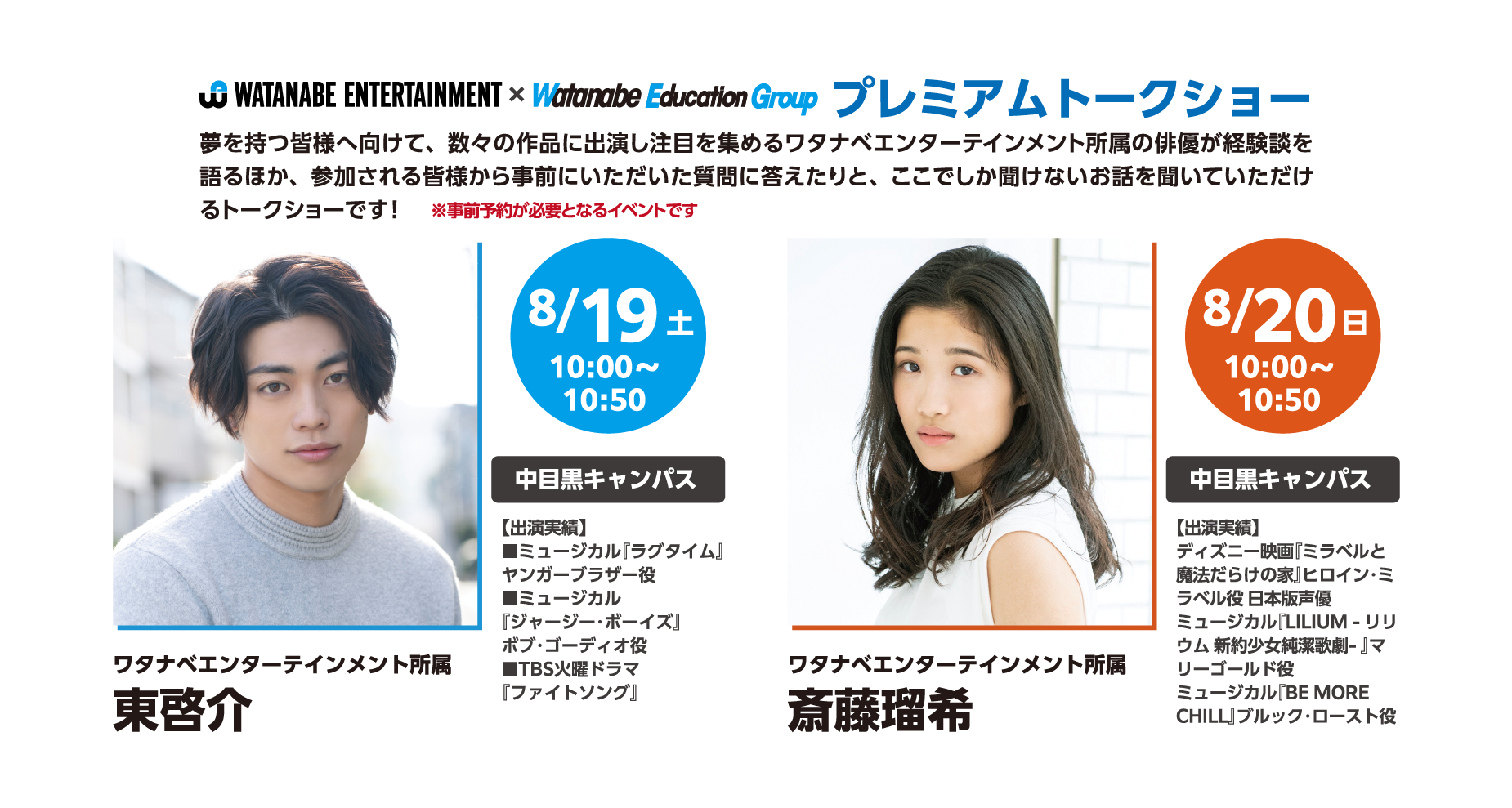 そして本イベントの最注目コンテンツとして、ワタナベエンターテインメント所属の俳優・東 啓介と、女優・斎藤 瑠希によるプレミアムトークショーが決定いたしました。(※事前予約制、定員になり次第終了)