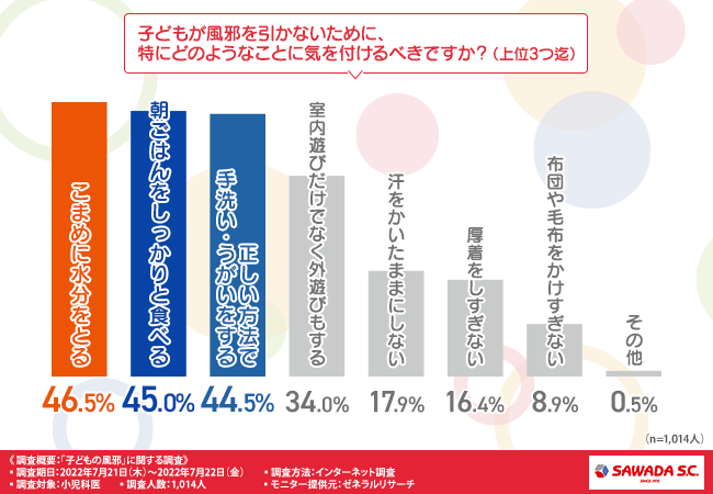 そこで、「子どもが風邪を引かないために、特にどのようなことに気を付けるべきですか?(上位3つ迄)」と質問したところ、『こまめに水分をとる(46.5%)』と回答した方が最も多く、次いで『朝ごはんをしっかりと食べる(45.0%)』『正しい方法で手洗い・うがいをする(44.5%)』『室内遊びだけでなく外遊びもする(34.0%)』『汗をかいたままにしない(17.9%)』と続きました。