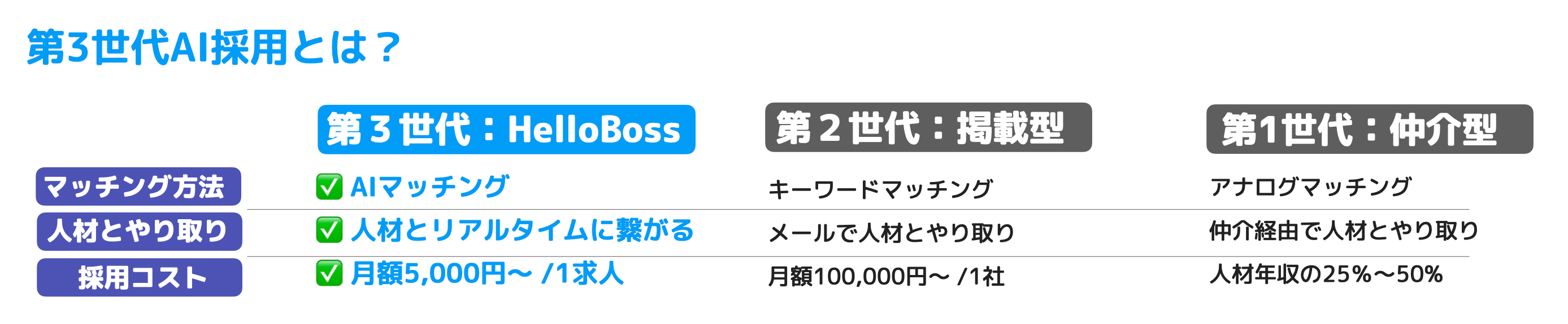 『HelloBoss』正式版は第3世代AI採用アプリです。AIによるマッチング、求人と求職側のリアルタイムのやり取り、そして低い採用コストでの求人サービスの利用が可能になることで、従来の「仲介型」や「掲載型」などの求人サービスと徹底的な差別化を図り、労働市場における人材流動性をさらに促進できるよう取り組んでいきます。
