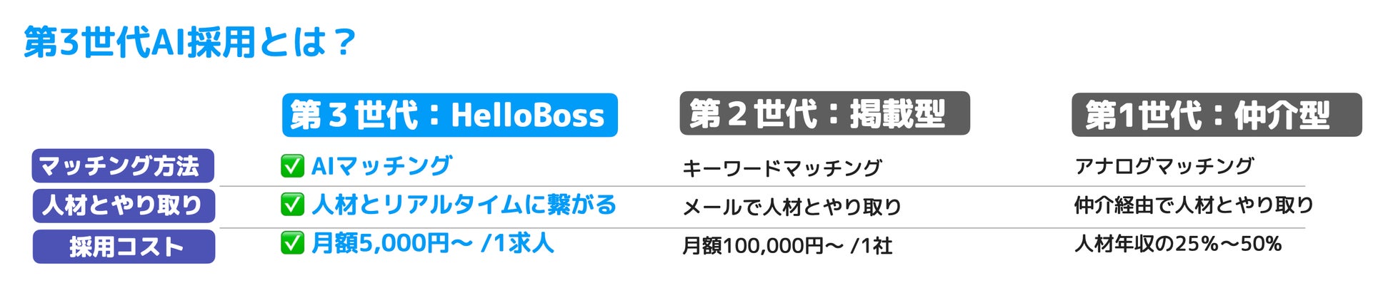 『HelloBoss』は、コストパフォーマンスの高いプランを通じて、マッチングを加速させ、マッチングの精度を高めることで、従来の費用の高さや採用工数の複雑さで求人サイトや人材紹介の利用を仕方なく諦めていた多くの中小企業を含めた、全ての企業に新たな採用ソリューションを提供しています。