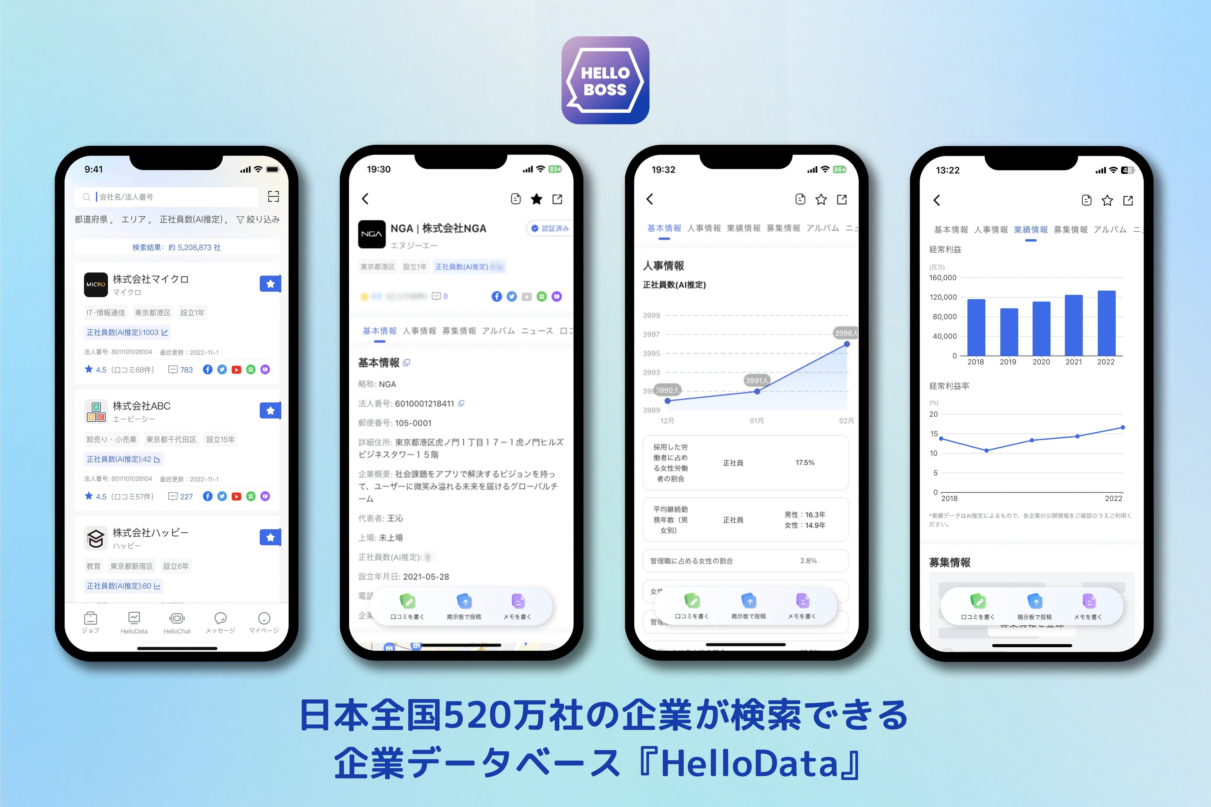 次世代アプリを開発・運営する株式会社NGA(本社:東京都港区、CEO:王沁、以下「NGA」)は、このたび、企業と求職者を直接つなぐ第3世代AI採用アプリ『HelloBoss』の正式版をリリースすることを発表します。正式版では、AI推薦による求人・求職機能が利用できるようになるほか、米国OpenAI社が手掛ける最近話題のチャットボットChatGPT相当の言語モデル「GPT-3.5」が実装され、日本で初めて*、求人サービスでの企業側の募集要項や求職者側の自己PRの自動作成が可能になり、ChatGPT技術による採用や求職に関するカウンセリングを受けることもできます。これらの機能と、β版で公開された全国520万社の企業データベース「HelloData」の新規追加機能の無料体験を提供します。