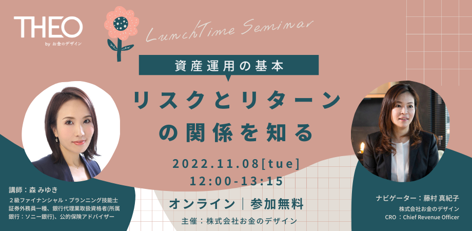 株式会社お金のデザインは、来たる11月8日(火)に、お金を学ぶランチタイム勉強会「資産運用の基本:リスクとリターンの関係を知る」をオンラインで開催いたします。