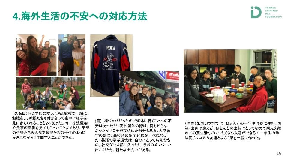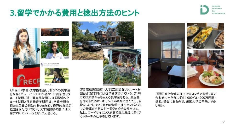 私は高校でも大学でも留学したのですが、高校の時は経団連、大学では江副記念リクルート財団からいただきました。久保田さんが言う通り、本当にアメリカの大学はお金がかかります。財団のような外部の奨学金もありますし、大学からの奨学金もあります。
