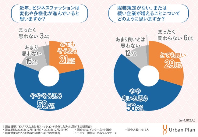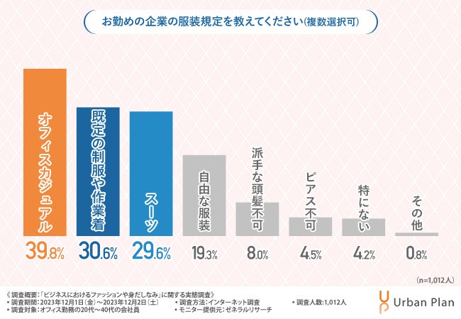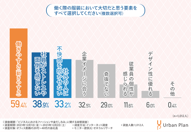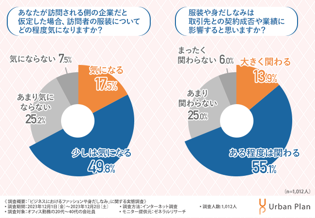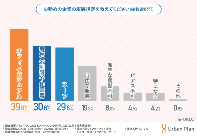 そこで今回、オフィスデザインやレイアウトをトータルコーディネートする株式会社アーバンプラン(https://urban-plan.com/)は、オフィス勤務の20代~40代の会社員を対象に、「ビジネスにおけるファッションや身だしなみ」に関する実態調査を実施しました。