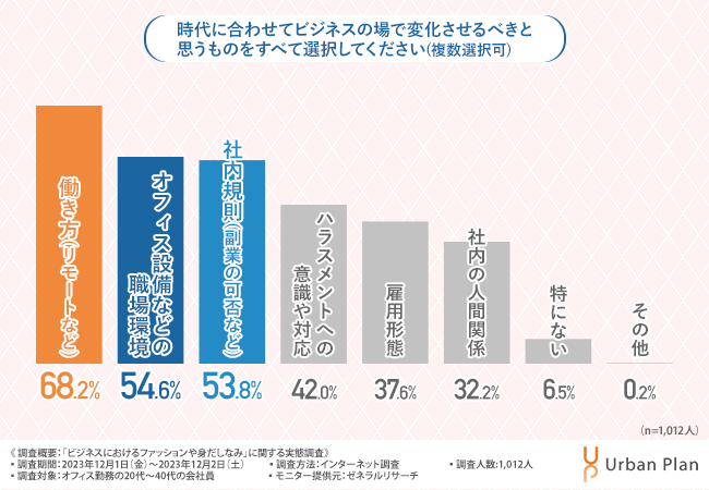 ファッション以外にも『働き方』『オフィス設備などの職場環境』も時代に合わせて変えるべきという意見が半数以上に