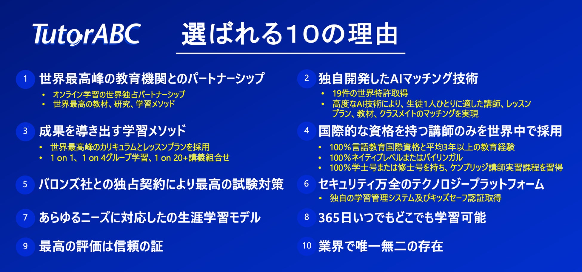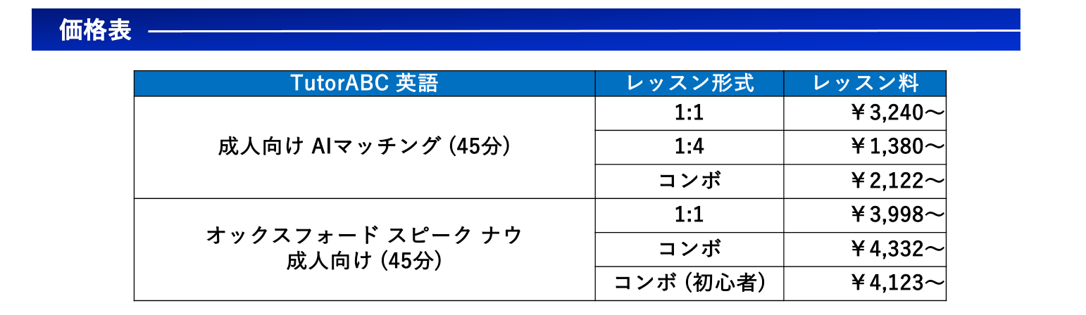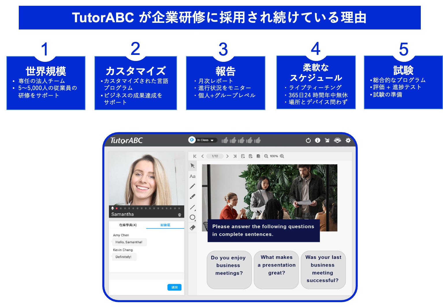 TutorABC社は、独自に開発した革新的なIT技術によるトップレベルの言語学習プラットフォーム、業界最高峰の講師陣と教材を使ったグローバルオンライン学習を提供することにより、70社を超えるグローバル企業の企業研修に採用され続けて来ました。ビジネスシーンには欠かせない、Emailなどのビジネス文章の書き方、ネットワーキング、 文面や口頭での報告の仕方、交渉、プレゼン、営業、面談、問題解決など、TutorABC社の独自の学習メソッドを組み合わせることにより、短期間で確実に成果を出しています。