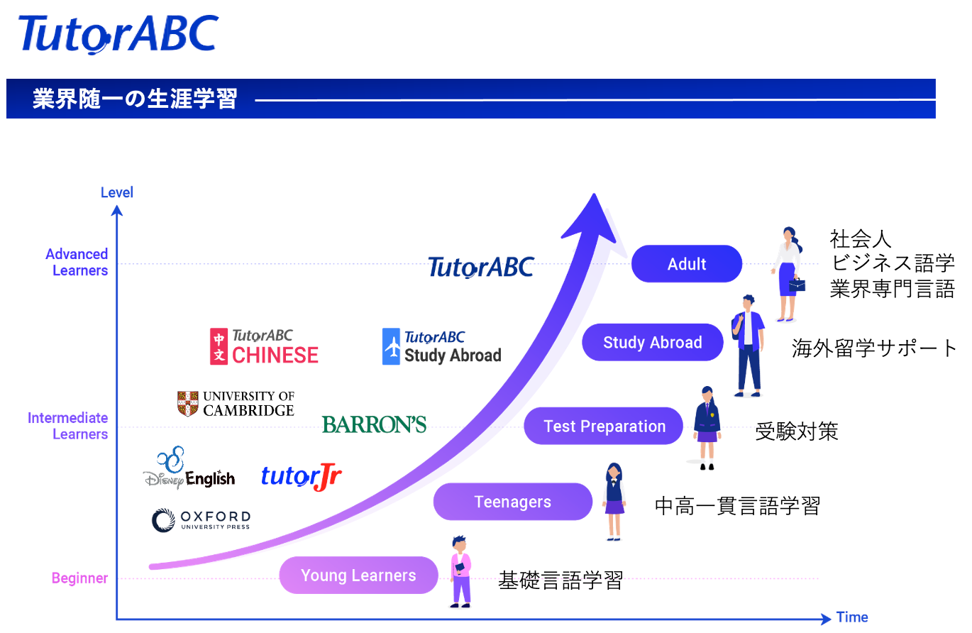 TutorABC社は、成人向け英語学習の”TutorABC”、子供向け英語学習の”tutorJr”と中国語学習の”TutorABC CHINESE”の3つのブランドで展開しています。世界最高峰の言語教育機関であるディズニーイングリッシュ、オックスフォード、ケンブリッジ、カプランとオンライン学習のパートナーシップを締結することにより、世界最高の教材、研究、学習メソッドを用いて、あらゆるニーズに対応した言語の生涯学習プログラムを提供しています。また、海外留学をサポートする専属のチームも揃えています。