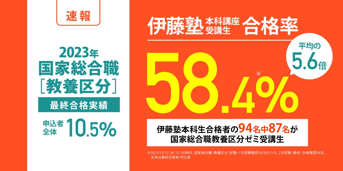 人事院は2023年12月13日(水)9:00に、令和5年(2023年)国家総合職[教養区分]試験の合格発表を行った。それを受け、法律資格専門の受験指導校『伊藤塾』(塾長 伊藤真)を運営する株式会社法学館(所在地:東京都渋谷区)は、受講生の合格実績の速報と喜びの声を公開した。