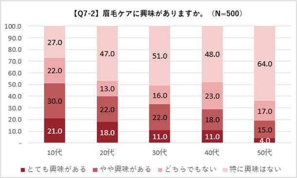 眉毛ケアに興味があるかを質問したところ「とても興味がある」(13%)あるいは「やや興味がある」(21.4%)となり、合計すると、全体のおよそ4割が「眉毛ケア」に対して興味を示していることがわかりました。