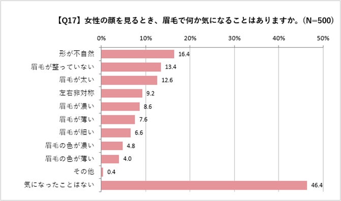 また「女性の顔を見るとき、眉毛で何か気になることはありますか」の質問について「気なること」を回答した人の中では、形が不自然(16.4%)、眉毛が整っていない(13.4%)、眉毛が太い(12.6%)が上位となりました。