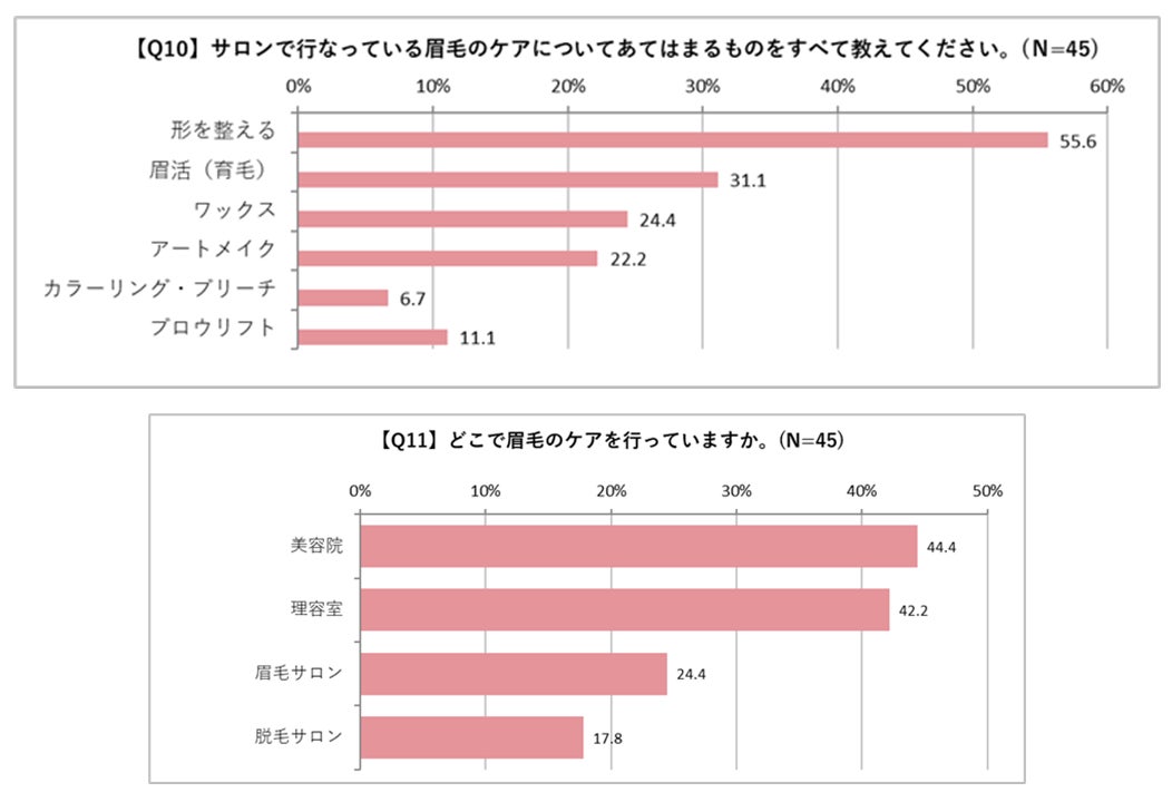 サロンで眉毛ケアをしている人のうち、サロンで行っている眉毛ケアの内容を質問したところ、最も多かったのが「形を整える」(55.6%)、次いで「眉活(育毛)」(31.1%)、ワックス(24.4%)という結果に。また施術を受けたことがある場所は「美容院」が最も多く44.4%で、次いで「理容室」42.2%、「眉毛サロン」24.2%という結果になりました。
