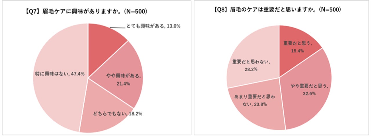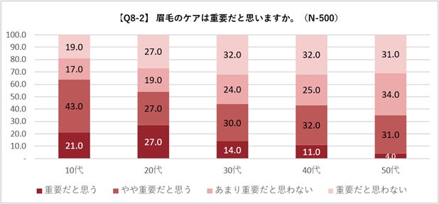 また、眉毛ケアは重要だと思うかの質問をしたところ、「重要だと思う」(15.4%)「やや重要だと思う」(32.6%)という回答の合計が、全体の約半数となりました。