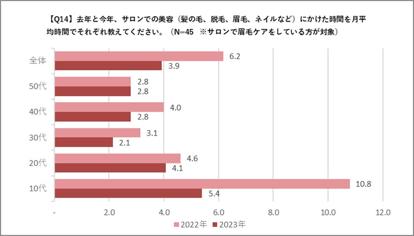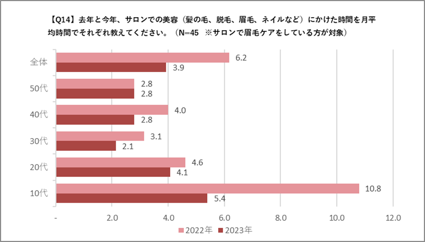また、サロンで眉毛のケアを普段行っている、あるいは、自分でもサロンでも眉毛ケアを普段行っているといった「普段からサロンで眉毛ケアをしている人」を対象に「サロンでの美容(髪の毛、脱毛、眉毛、ネイルなど)にかけた月平均時間を教えてください」という質問をしたところ、全世帯で時間が短縮されており、特に10代では、月平均所要時間10.8時間から5.4時間と5割も大幅短縮短していることが判明しました。今後は特に、若い世代を中心にタイムパフォーマンスが良い美容の需要が高まると推測されます。