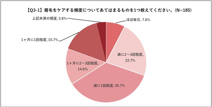 また眉毛をケアする頻度について質問したところ、最も多かったのは「週に1回程度」(35.7%)、次いで「週に2~3回」(22.7%)、「1ヶ月に2~3回程度」(14.6%)、また「ほぼ毎日」と答えた方が7.6%という結果となり、全体の66%の方が週に最低1回以上は眉のケアをしていることがわかりました。