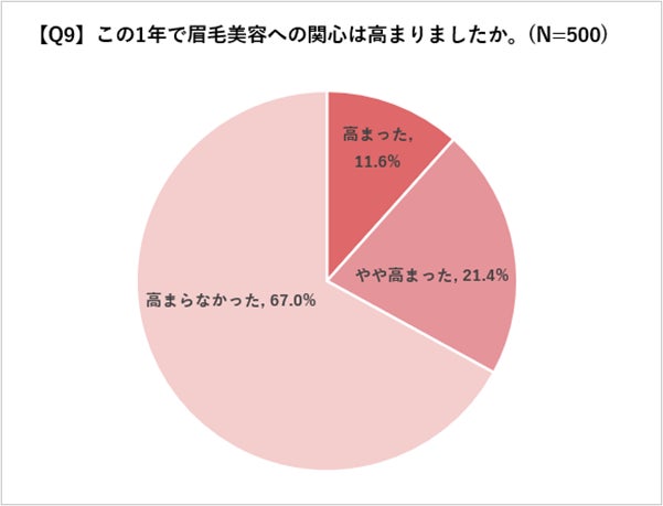 更に、この1年で眉毛美容への関心が高まったかの質問について、「高まった」(11.6%)あるいは「やや高まった」(21.4%)と答えた人を合計すると、約3人に1人が、眉への関心の高まりを感じていることがわかります。