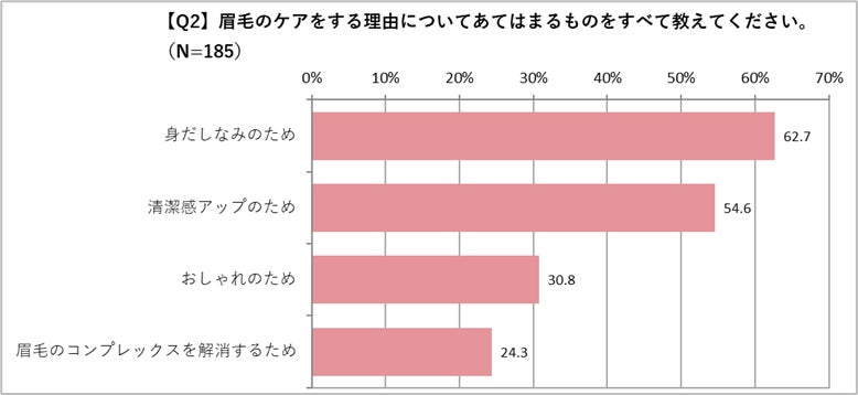 続いて眉毛のケアをする理由について質問したところ、最も多い回答は「身だしなみのため」(62.7%)、次いで「清潔感アップのため」(54.6%)で、過半数の方が身なりを整えるためにケアを行っていることがわかりました。