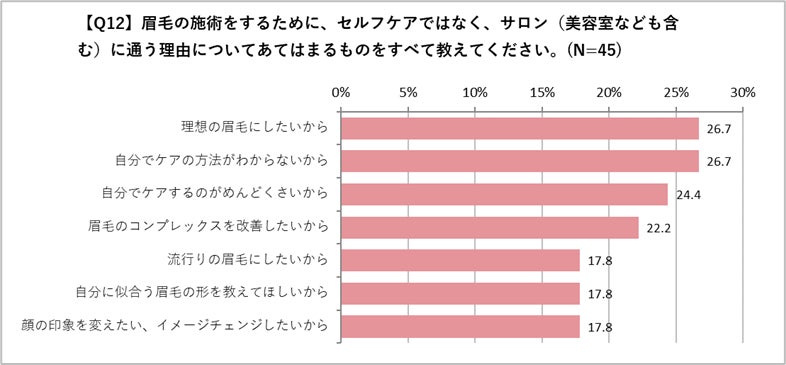 眉毛に関する施術を受けにサロンに通う理由を質問したところ、1位から3位までが僅差で、「自分でケアの方法がわからないから」と「理想の眉毛にしたいから」が26.7%で最も多く、次いで「自分でケアするのがめんどくさいから」(24.2%)、「眉毛のコンプレックスを改善したいから」(22.2%)という結果となりました。自分の理想の眉になりたいという希望と、自分でケアする手間暇やコンプレックスを解消する目的でサロンに通っていることが伺えます。