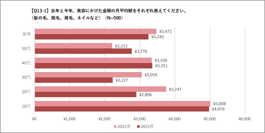 「去年と今年、美容(髪の毛、脱毛、眉毛、ネイルなど)にかけた金額の月平均額をそれぞれ教えてください」という質問に対し、50代を除く全世帯で若干の減少が見られ、全体でみると昨年から228円マイナスの結果になりました。